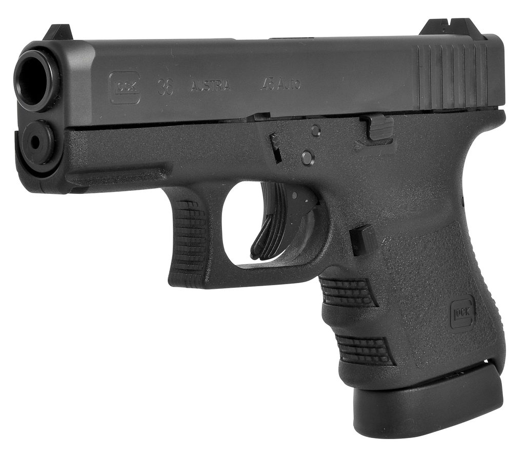 Pistole GLOCK 36 s dvouřadým zásobníkem je v ráži .45 ACP. Pistole je vhodná pro denní nošení a terčovou střelbu. Standardně jsou pistole Glock dodávány v sadě s 2 ks zásobníky na 6 nábojů. Dále je dodáván s kufříkem na zbraň, základním čištěním. Model 36 je častou volbou střelců, kteří chtějí spolehlivou a pohodlnou zbraň pro sebeobranu a zájmovou střelbu na střelnici. Zbraň má služební rozměry (policejní velikost pistole - Compact) a nízkou hmotnost. Model 36 je jediný jednořadý Glock v ráži .45 ACP.