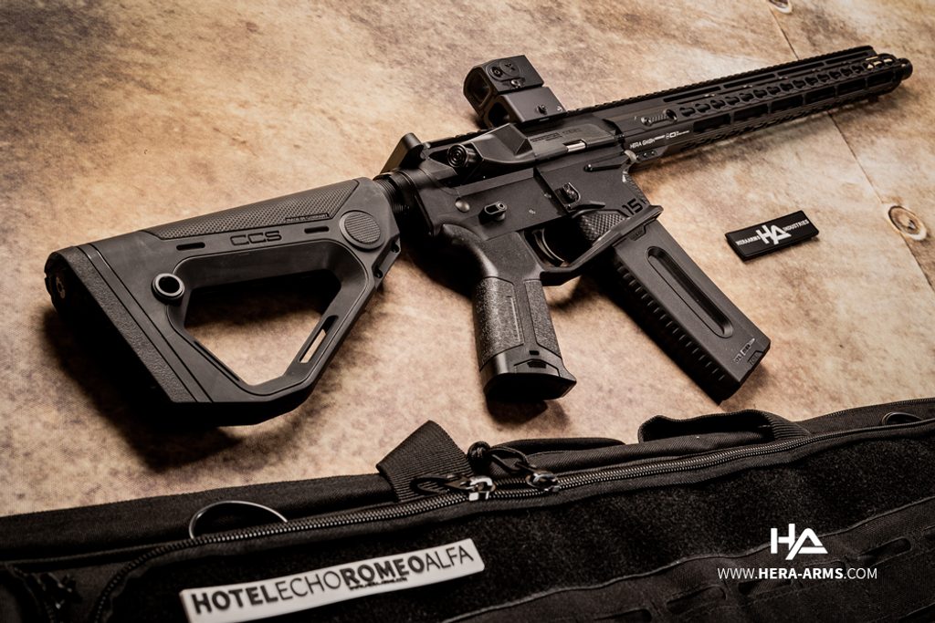 Kvalitní poloautomatická puška typu AR-15 německé firmy Hera Arms 15th - s délkou hlavně 16,75". Ráže .223 Remington. Stoupání hlavně je 1/9. Zbraň je osazena montážní lištou weaver 22 mm pro umístění optického zařízení a jiného příslušenství nad hlaveň. Předpažbí je vybaveno montážním systémem typu key-mode. Hlaveň je osazena tlumičem záblesku A2. Pistolová rukojeť má krytý prostor v rukojeti pro příslušenství (baterie,...). Nastavitelná pažba. Barva černá.