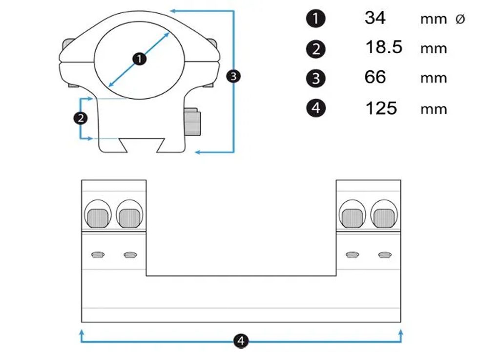 Výška montáže měřeno od montážní lišty po osu puškohledu 35,5 mm, výška montáže měřená od lišty po hranu puškohledu je 18,5 mm. Délka montáže je 125 mm, tloušťka jednotlivých upínacích ok je 25 mm.