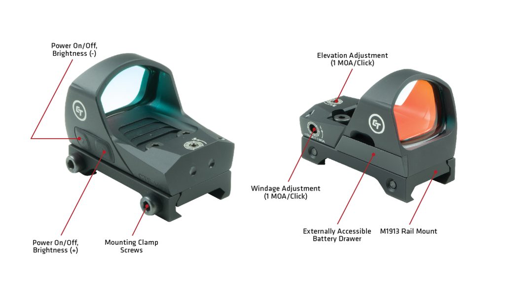 Elektronický zaměřovač CTS-1400 je kompaktní otevřený reflexní zaměřovač pro pušky a brokovnice. Díky kulatému zaměřovacímu bodu 3,25 MOA a širokému zornému poli (FOV) CTS-1400 okamžitě zlepší přesnost Vaší pušky nebo brokovnice. CTS-1400 uživatel snadno nainstaluje a je vybaven nízkoprofilovou montáží M1913 Picatinny.