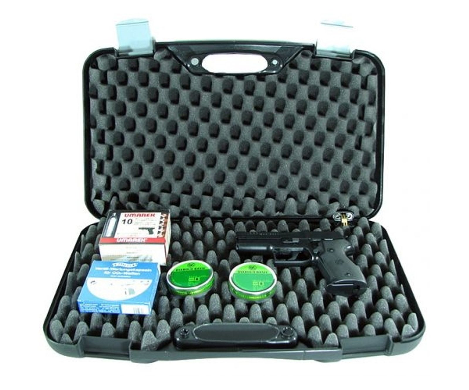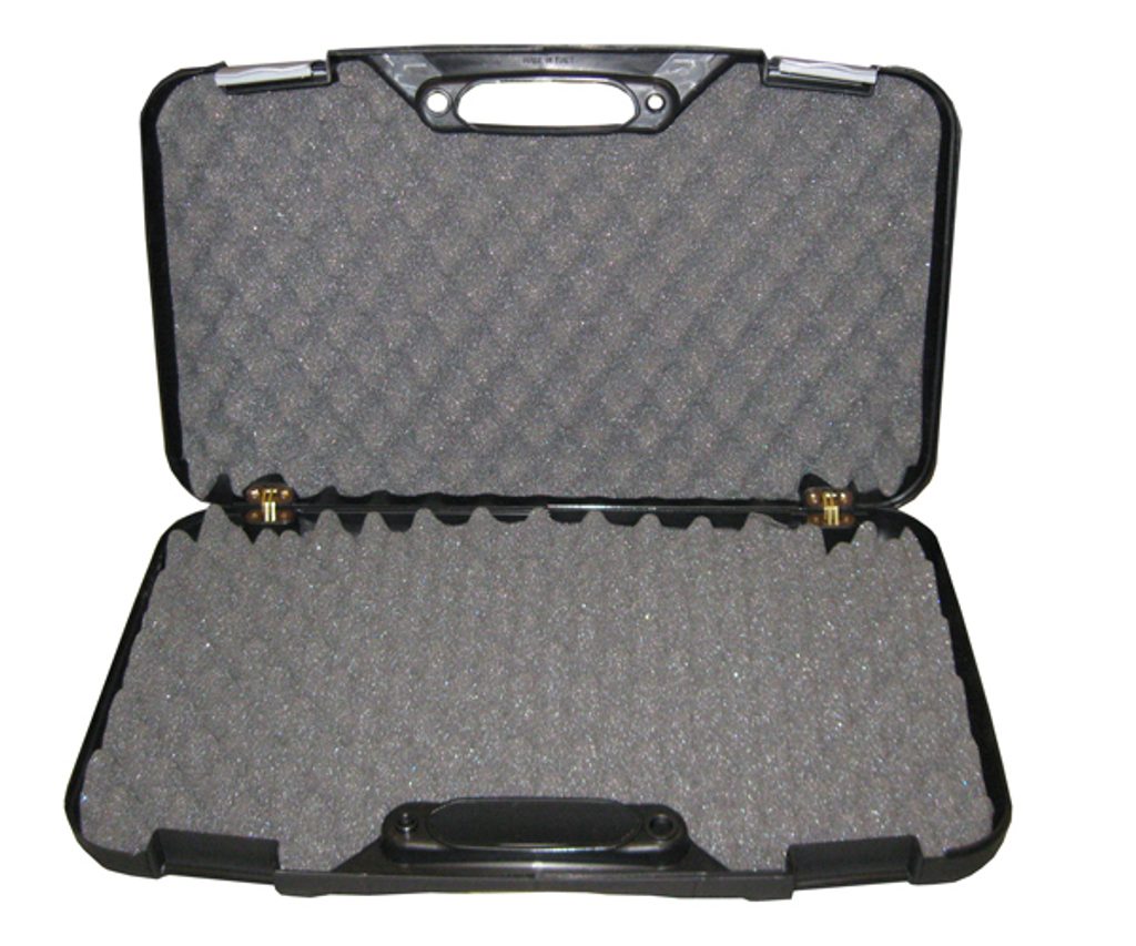 Kufr na pistoli o rozměrech 50x30x8,5cm vyrobený z tvrzeného polymeru s kvalitním zpracováním od italského výrobce Megaline. Vnitřní povrch kufru je vyplněn molitanovou vložkou se strukturou tzv. žraločí čelisti, která zabraňuje pohybu zbraně. Kufr má dvě zacvakávací packy a panty jsou pro větší odolnost kovové.