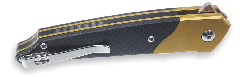 Nůž Amare Pocket Peak Folder Gold má čepel z oceli 14C28N o délce 89 mm a tloušťce 3 mm. Celková délka nože je 212 mm, hmotnost nože 133 g. Zámek Liner Lock, otvírací mechanismus ploutev, délka zavřeného nože 121 mm.
