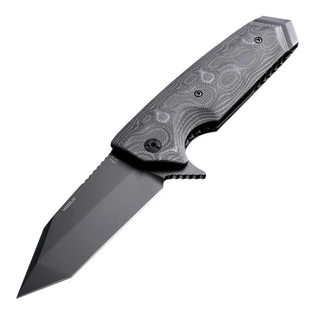Zavírací nůž Hogue EX-02 3.75" Tanto Flipper G-10 G-Mascus Gray, který navrhnul Allen Elishewitz. Čepel z kryogenicky ošetřené nerezové oceli 154CM (tvrdost 57-59 HRC) s povrchovou úpravou černý cerakote. Zámek PushButton s manuální pojistkou. Rukojeť G-10 G-Mascus s texturou Mini Piranha. Pocket clip je vpravo, střenka obsahuje díru pro lanyard. Celková délka nože 222 mm, délka čepele 95 mm a délka rukojeti 127 mm. Vyrobeno v USA.