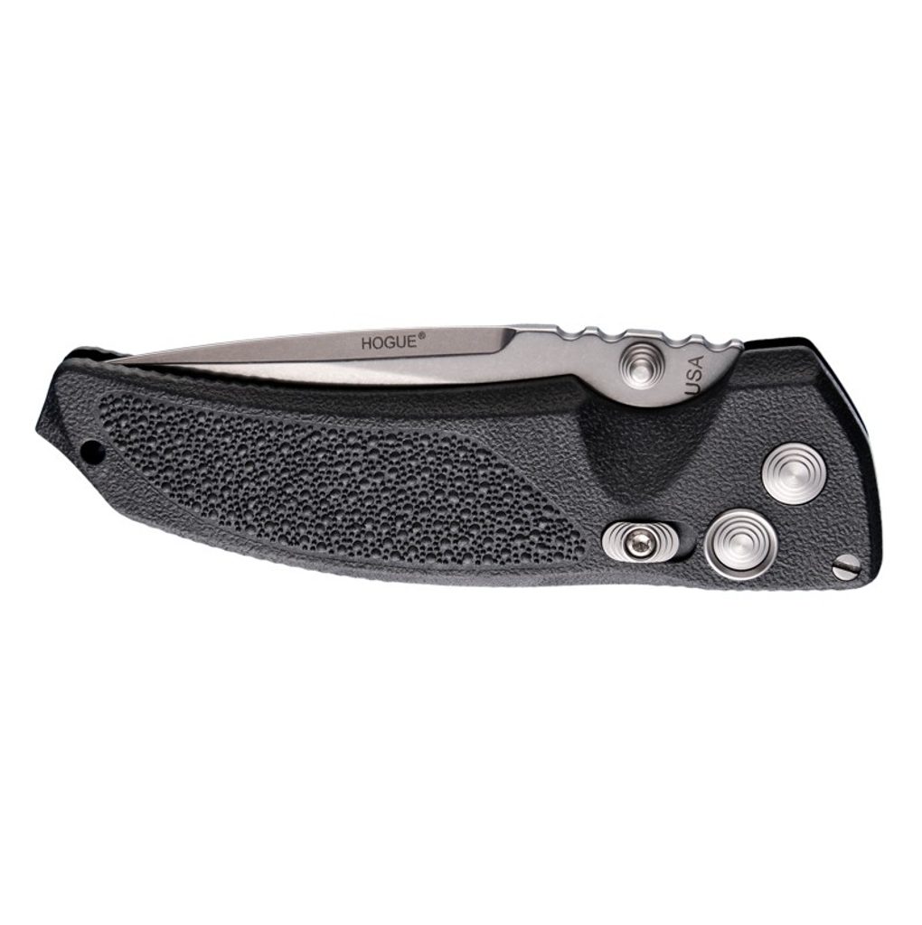 Nůž Hogue EX-03 3,5" Drop Point Blade Black Polymer, který navrhnul Allen Elishewitz. Čepel Drop Point s oboustranými palcovými čepy. Materiál čepele je z kryogenicky ošetřené nerezové oceli 154CM (tvrdost 57-59 HRC) s ručně broušeným ostřím. Zámek PushButton s manuální pojistkou pro uzamčení. Rukojeť je matný černý polymer s texturou. Pocket clip je vpravo, střenka obsahuje průvlak pro lanyard. Celková délka nože 206 mm, délka čepele 89 mm a délka rukojeti 117 mm. Vyrobeno v USA.