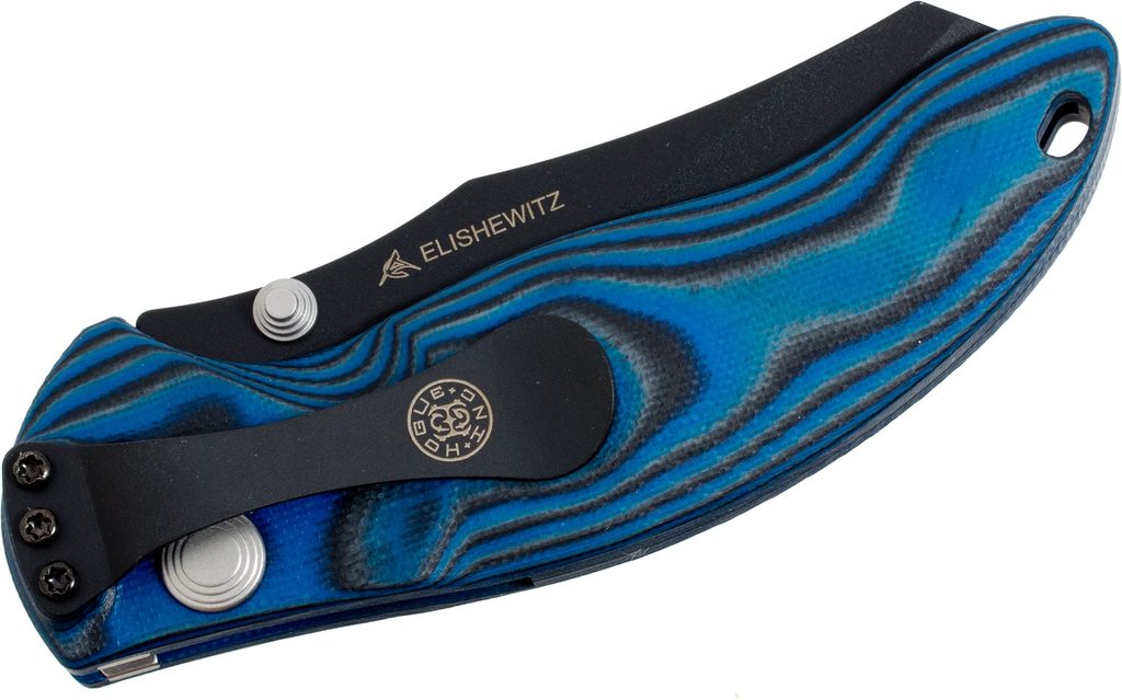 Zavírací nůž Hogue EX-04 3,5" Wahrncliffe G-10 Blue Lava, který navrhnul Allen Elishewitz. Čepel Wahrncliffe z kryogenicky ošetřené nerezové oceli 154CM (tvrdost 57-59 HRC) s povrchovou úpravou černý cerakote. Zámek PushButton s manuální pojistkou. Rukojeť G-10 G-Mascus s texturou Mini Piranha. Pocket clip je vpravo, střenka obsahuje díru pro lanyard. Celková délka nože 203 mm, délka čepele 89 mm a délka rukojeti 117 mm. Vyrobeno v USA.