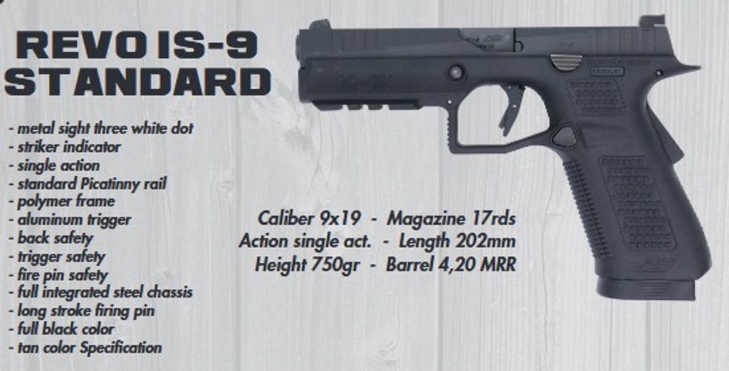 Revo IS9 je samonabíjecí pistole kompletně vyrobená v Itálii s velmi inovativními funkcemi a kombinací spolehlivých mechanismů. Díky úpravám klasického Browningova spoušťového systému typu 1911 bylo možné snížit osu hlaveň blíže k dlani (na pouhých 1,12″/28,45 mm). Tyto úpravy zaručují lepší chod zbraně a mnohem stabilnější chování pistole při střelbě. IS9 je vybavena dlaňovou pojistkou, proti-pádovou pojistkou a SA spouští (jednočinná spoušť stejně jako u pistole 1911). Pistole používá zásobníky Glock 17. Ráže pistole je 9 mm Luger (9X19 mm). Tří bodová kovová mířidla s bílou tečkou. Hliníková spoušť. Polymerový rám (není signovanou částí zbraně). Rám se dá vyměňovat za jiné typy, které v budoucnu výrobce uvede na trh. mechanismus spoušťového ústrojí je signovanou částí rámu. Picatinny/Weaver lišta 22 mm pod hlavní pro příslušenství.