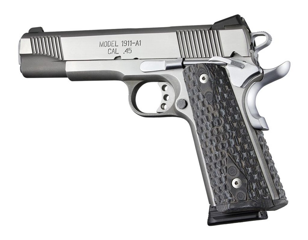 Střenky Hogue pro pistole typu 1911 Govt. materiál G10, barva černá, zdrsněná. Sada obsahuje střenky + domeček pružin ("hřbet" rukojeti). Střenky vytváří svým tvarem magwell pro snadnější navedení zásobníku do zbraně.