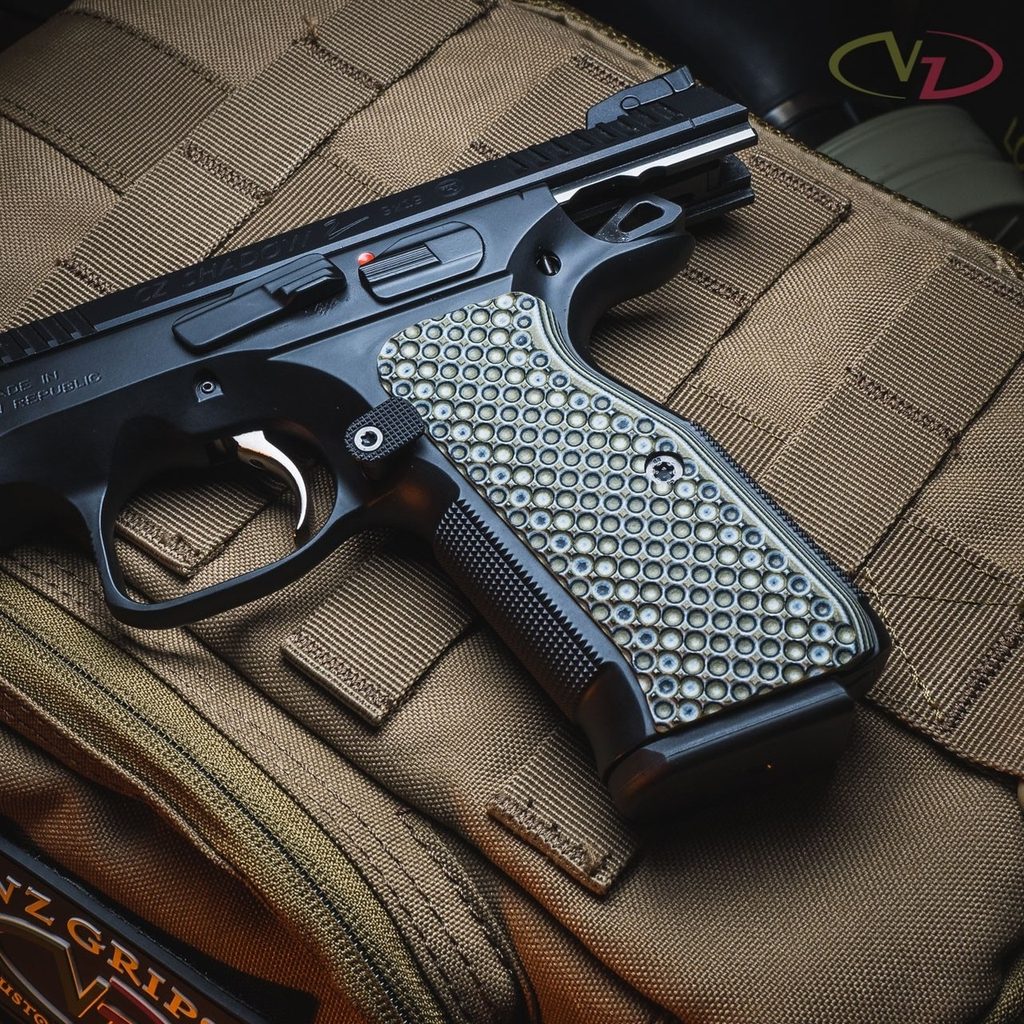 Střenky světoznámé společnosti VZ Grips pro pistole typu CZ Shadow 2. Materiál G10, barva Hyena Brown (písková a hnědá). Zdrsnění je velmi agresivní a proto vhodné spíše pro přesnou a sportovní střelbu. Toto zdrsnění poskytuje střelci jistotu, že mu zbraň nevyklouzne nebo nevypadne z ruky a to i když bude mít střelec ruce splavené potem.