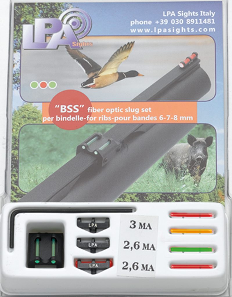 Univerzální světlovodná mířidla výrobce LPA jsou určená pro brokovnice s šířkou lišty 6, 7 a 8mm. Sada obsahuje zadní mířidla se dvěma zelenými světlovodnými vlákny, přední mušku se závitem 2,6 mm a závitem 3 mm, 3ks náhradních světlovodných mušek ( červená, žlutá a zelená)a klíč pro utažení miřidel.