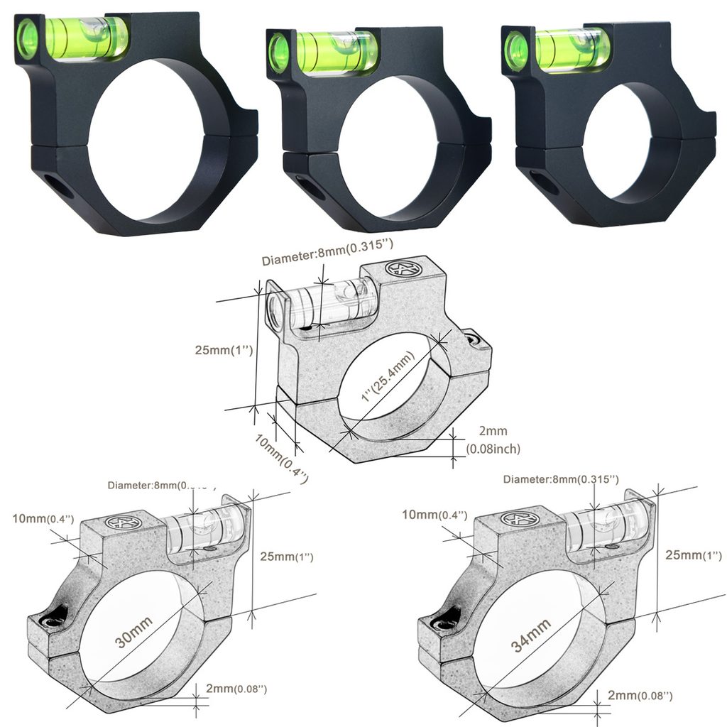 Vodováha je oboustranná a je možné umístit na levou tak i na pravou stranu puškohledu. Viskózní tekutina uvnitř vodováhy zajistí vždy jen jednu bublinu. Šířka montážního kroužku je 10mm