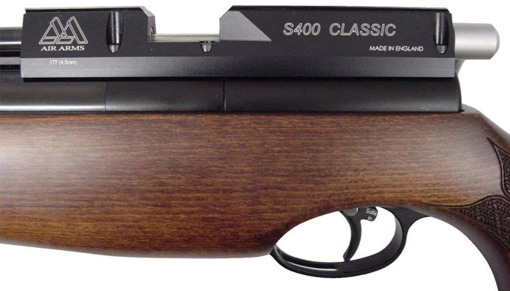 Vzduchovka Air Arms S400 Classic cal. 5,5mm je jedna z nejoblíbenějších zbraní, která se v hojné míře používá při závodní střelbě i při lovech. S400 je prověřena mnoha mezinárodními soutěžemi a dokáže být stejně dobrá, také při lovu. Jedná se o velice dobře vyváženou zbraň, která umožní každému střelci zasáhnout přesně svůj cíl. Hlaveň je Lothar Walther, 12 mm (vnější průměr), 12-ti rýhové drážkování. Kartuše má ocelové tělo s koncovkami z vysoce pevnostního hliníku a je opatřená quickfillem. Buková pažba typu Monte Carlo s laserovým gravírovaním, které nejen že dobře vypadá, ale také usnadňuje držení. Spoušť je sportovní dvoupolohová s nastavitelným odporem i délkou. Vzduchovka nemá mířidla, protože se zde počítá s montáží puškohledu. Vyobrazený puškohled není součástí balení.