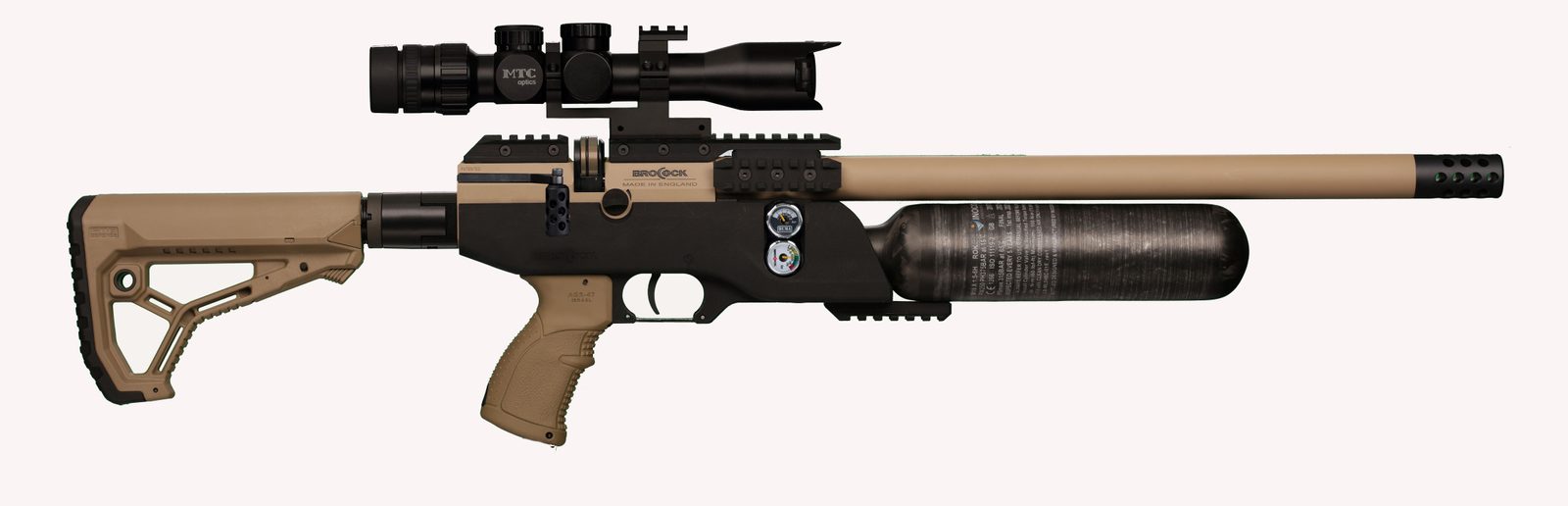 Taktická vzduchovka BRK (Brocock) Commander HiLite XR v cerakote provedení s kevlarovou kartuší a sklopnou pažbou s pistolovým úchopem těží také ze vzájemné spolupráce (Daystate a BRK). BRK Commander HiLite XR má vylepšený patentovaný systém „Slingshot Hammer“, který zajišťuje lepší dávkování vzduchu a nižší spotřebu. Tento systém spolu s regulátorem tlaku nizozemského výrobce Huma a vylepšuje konzistenci střel vzduchovka je daleko přesnější jako konkurence.