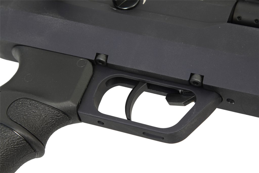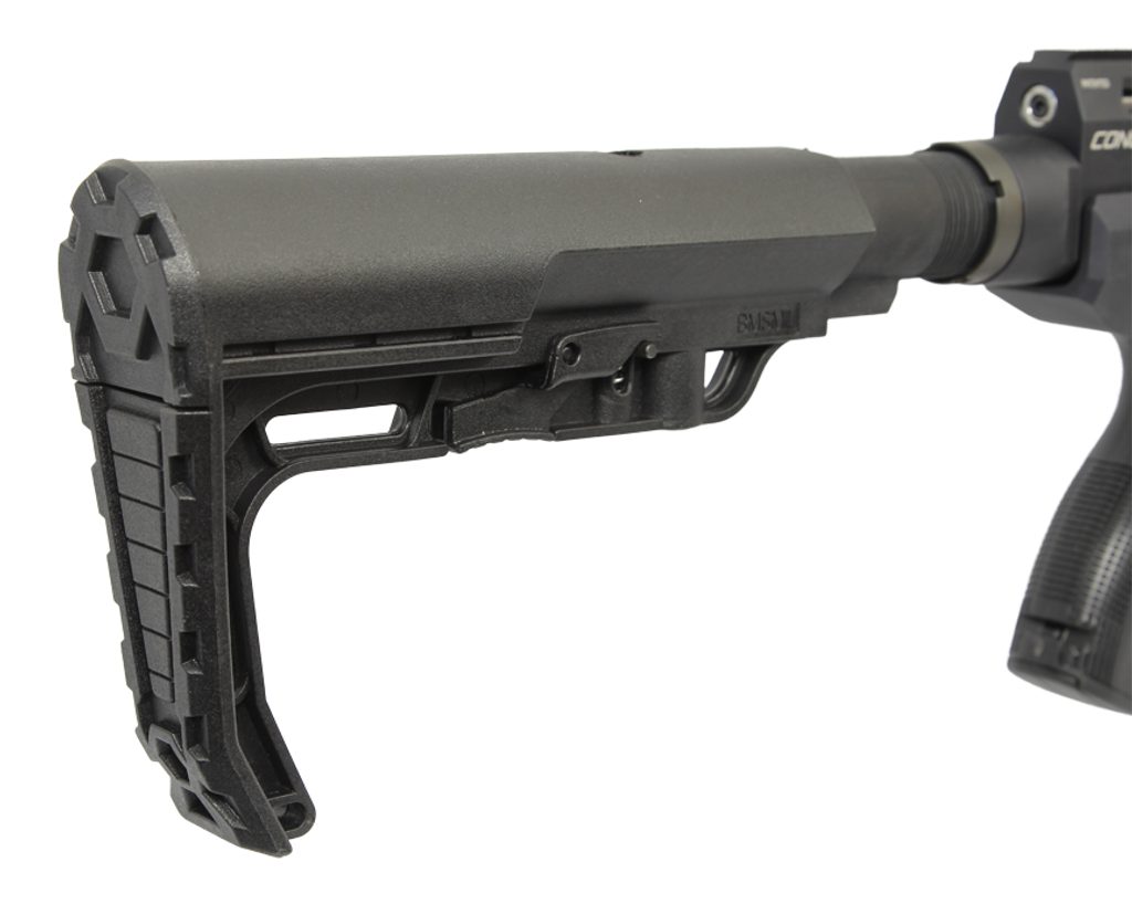 Spoušt vzduchovky nastavitelná a v přední části je umístěná pojistka. Přebíjení vzduchovky je pomocí boční páčky – Side Lever Action. Toto řešení nám přijde pohodlnější než u předchozí verze modelu BRK Concept Lite, který měl přebíjení pomocí přímotažného závěru. Montážní lišta pro puškohled, případně kolimátor je weaver, montážní lišta pro doplňky je také weaver a umístěná v přední části pažby pod kartuší. Sklopná pažba je kompatibilní s doplňky pro AR15 a pistolová rukojeť je shodná s pistolovou rukojetí typu AK 47.