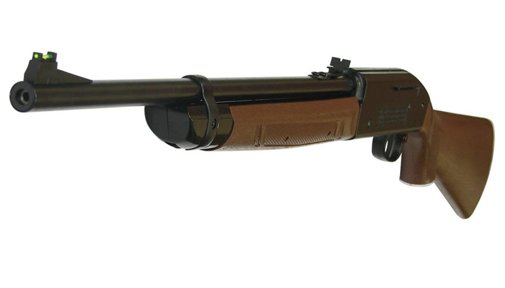 Vzduchovka Crosman 2100B cal. 4,5mm od amerického výrobce se systémem pumpy umístěným v přední části pažby. Pro plné naplnění vzduchového zásobníku je potřeba 4 - 5 stlačení. Vzduchovka používá jako střelivo ocelové BB broky nebo olověné diabolky. Zásobník pojme 17 broků a rezervoár 200 broků.