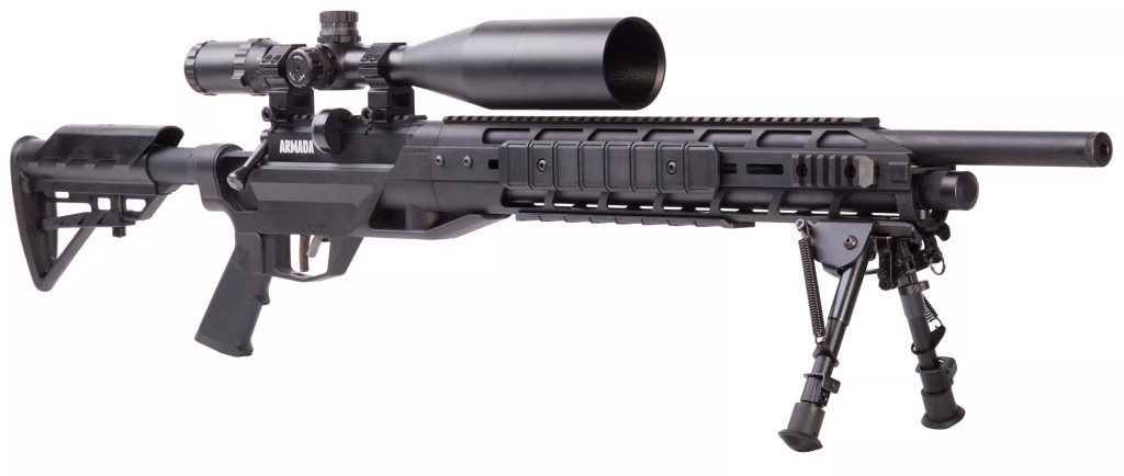 PCP vzduchovka Crosman Benjamin Armada 5,5mm v taktickém setu s puškohledem CenterPoint 4-16x56mm a bipodem. Vzduchovka je výraběna přímo v USA a díky tomu je zbraň velice kvalitně zpracovaná a přesná. Vzduchovka má taktickou pažbu s možností posuvným nastavením lícnice a botky. Pažba vzduchovky je oboustranná a vzhledem k tomu, že je možné kličku přebíjení předělat na druhou stranu, je vzduchovka vhodná i pro leváky.