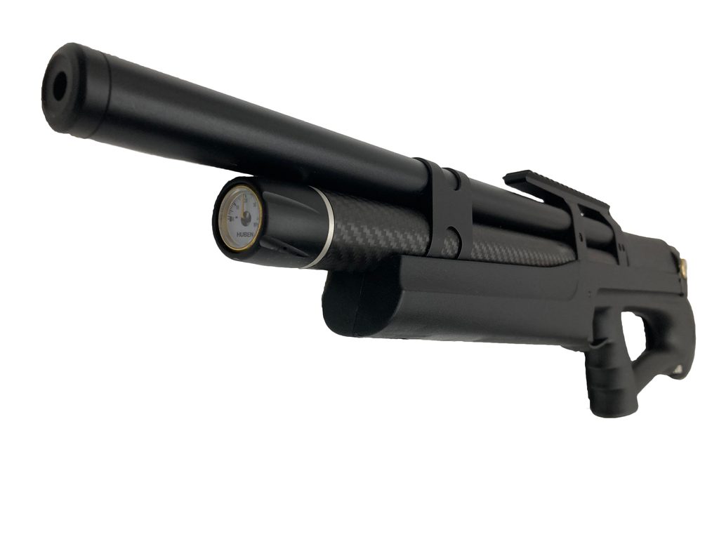 Vzduchovka Huben K1 6,35 mm je jediný spolehlivý semiauto bullpup v naší nabídce. Huben K1 je větrovka (PCP) v provedení semiauto, to znamená že vzduchovku nemusíte po každém výstřelu znovu natahovat. Huben K1 je netradiční Bullpup, který je dodáván v černé plastové pažbě, která je tzv. ambidextrous a je vhodná jak pro praváka, tak i pro leváka. Vysokopevnostní kartuše titan-dural s povrchovou úpravou "kevlar" má objem 292cm3 a plní se pomocí přiloženého quickfillu až do tlaku 350BAR. Quickfill však nemá závit a pro plnění pomocí tlakové láhve nebo pumpy je potřeba ještě rychlospojka.