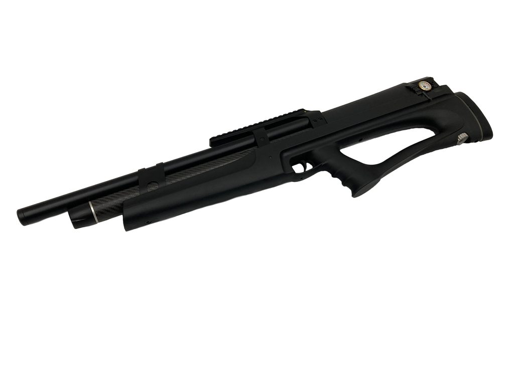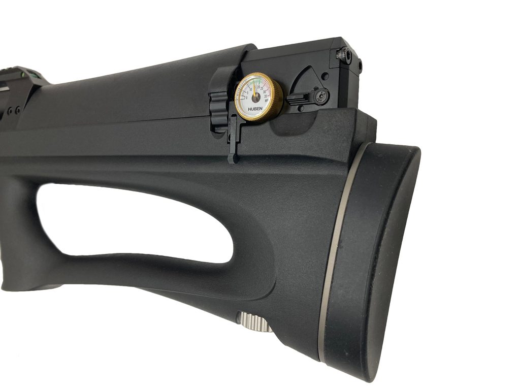 Vzduchovka Huben K1 v2+ 5,5mm je jediný spolehlivý semiauto bullpup v naší nabídce. Huben K1 je větrovka (PCP) v provedení semiauto, to znamená že vzduchovku nemusíte po každém výstřelu znovu natahovat. Huben K1 je netradiční Bullpup, který je dodáván v černé plastové pažbě, která je tzv. ambidextrous a je vhodná jak pro praváka, tak i pro leváka. Vysokopevnostní kartuše titan-dural s povrchovou úpravou "kevlar" má objem 292cm3 a plní se pomocí přiloženého quickfillu až do tlaku 350BAR. Quickfill však nemá závit a pro plnění pomocí tlakové láhve nebo pumpy je potřeba ještě rychlospojka.