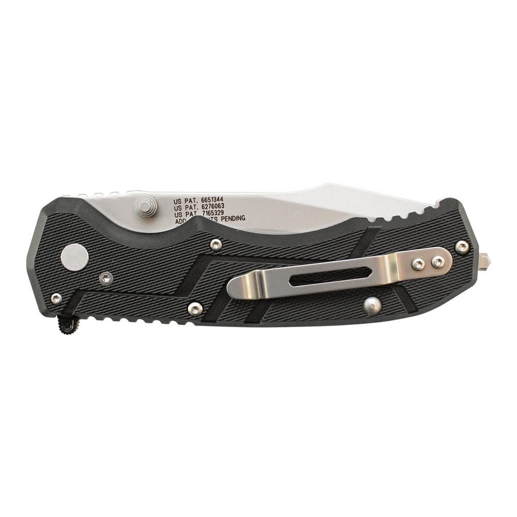 Zavírací záchranářský nůž Schrade SCH911, čepel Blunt Tip zoubkované z oceli 4034. Typ otevírání Flipper s kolíčky s podporou otevírání. Zámek LinerLock s pojistkou. Rukojeť FRN s výklopným řezačem bezpečnostních pásů a rozbíječem skla. FRN je skelnými vlákny vyztužený nylon. Jedná se o vysokopevnostní kompozit. Pocket clip je vpravo. Délka čepele 90 mm, délka rukojeti 120 mm, celková délka 210 mm. Hmotnost nože 159 g.
