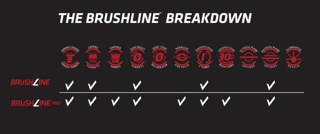 Puškohledy Crimson Trace - Brushline jsou navržena s ohledem na pro lovecké potřeby a přesnou střelbu na terč a byla tak záměrně postavena od základu. Řada Brushline zahrnuje puškohledy pro pistole, malorážky, brokovnice a lovecké pušky. Tato řada je vybavena tubusem o průměru 1 ”a 30 mm a jsou vyrobeny z hliníku pro letecký průmysl. Puškohledy jsou vyrobeny tak aby vydržely i tvrdé zacházení a při tom si udržely nízkou hmotnost. Puškohled nabízí výjimečnou propustnost světla a kvalitu skel. Puškohledy jsou plněné dusíkem, povrch je oděru odolný, vodotěsný a připravené na jakékoli podmínky, se kterými se setkají.